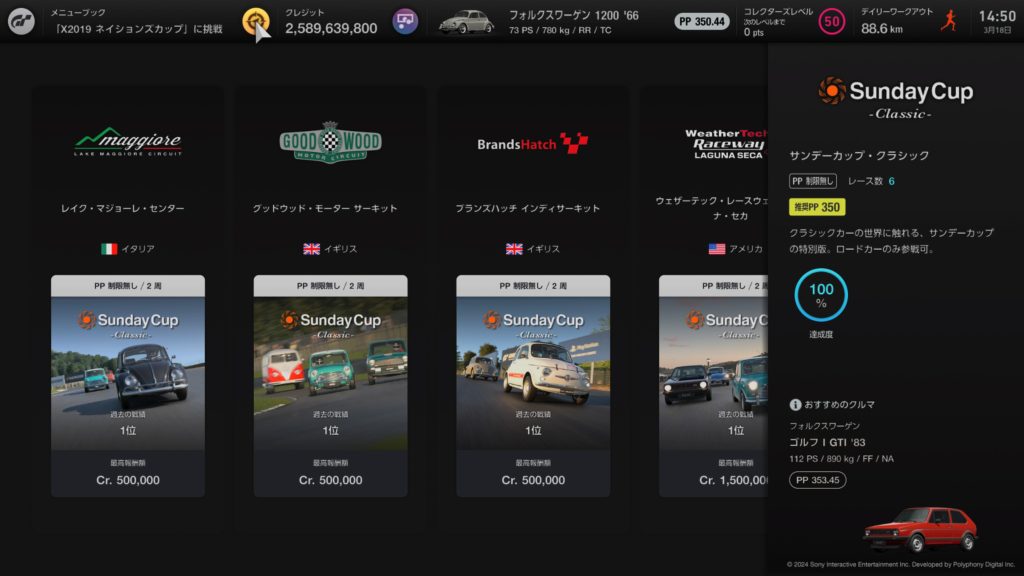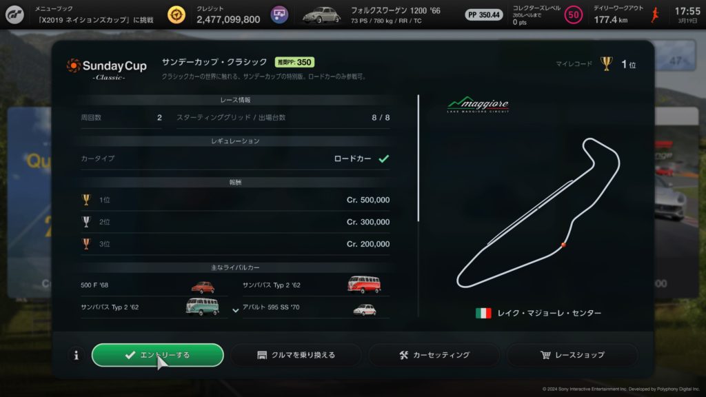 サンデーカップはPP制限はないので、速い車で行ってもいいのですが、そこはあえて同条件の車で推奨PP350にて挑戦です。