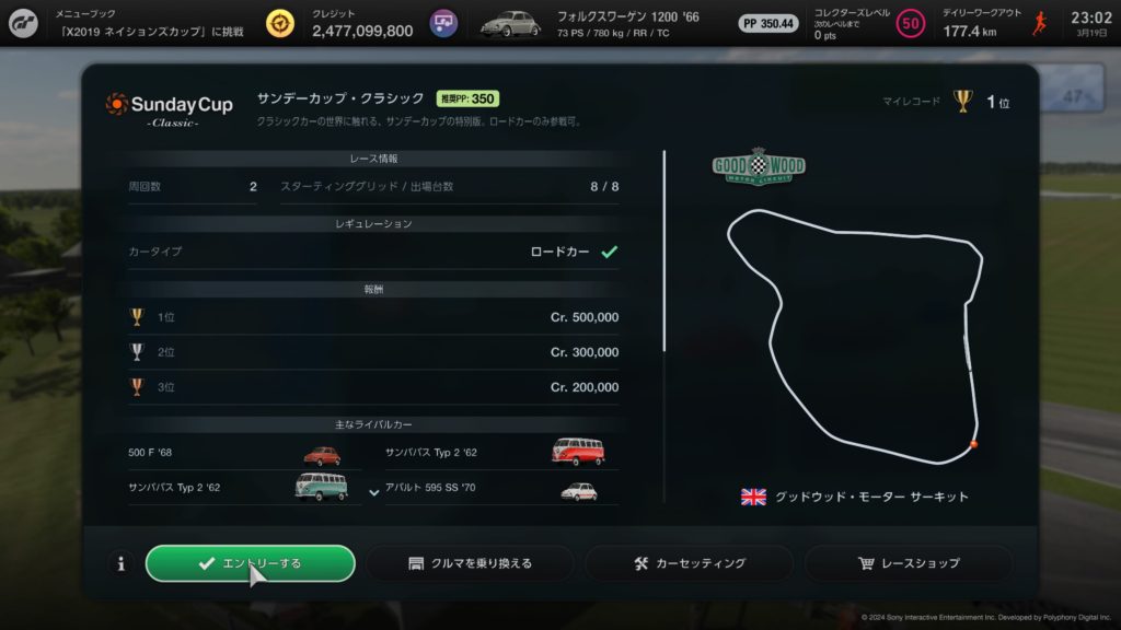 ただし今回は上記のページでサンデーカップ用に作ったフォルクスワーゲン 1200 ‘66で、PP350縛りのクリーンレースボーナスでクリアするという条件でチャレンジしました。